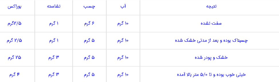 افزودن هر یک از مواد زیر در نتیجه حاصل موثر است: بوراکس باعث بالا آمدن توپ میشود. چسب باعث میشود که اجزای توپ به هم بچسبند و نشاسته باعث میشود که توپ به دست یا زمین نچسبد. مقدار هر یک از این مواد بر کیفیت توپ حاصل تاثیر گذار است. در جدول زیر توپهایی با مقادیر مختلفی از مواد اولیه تهیه شده و نتیجه حاصل ارائه شده است.