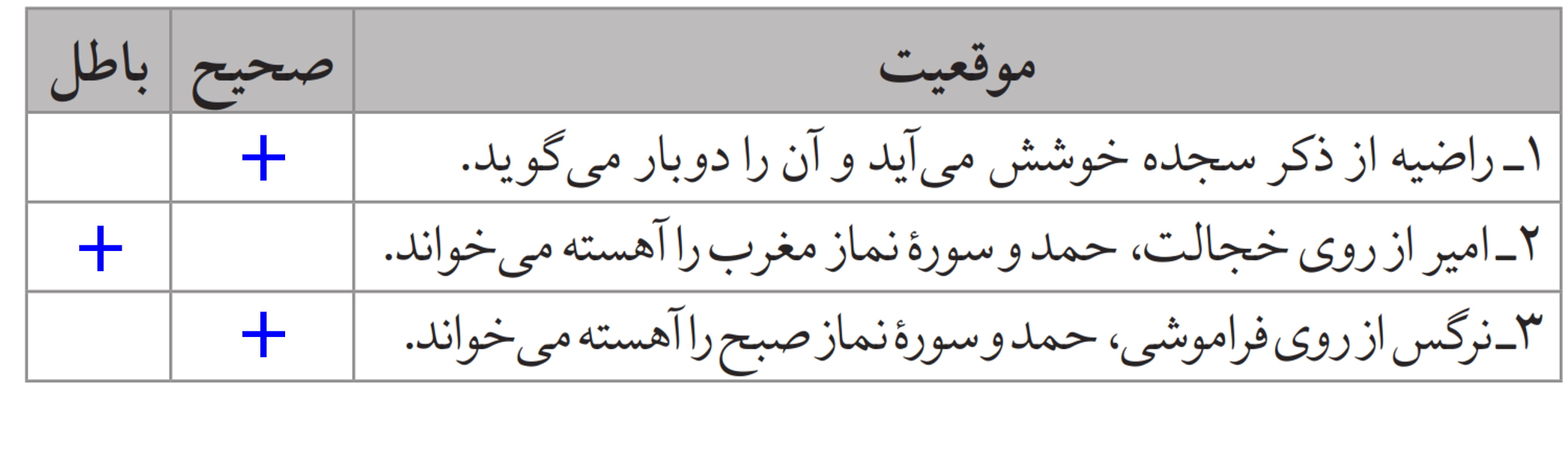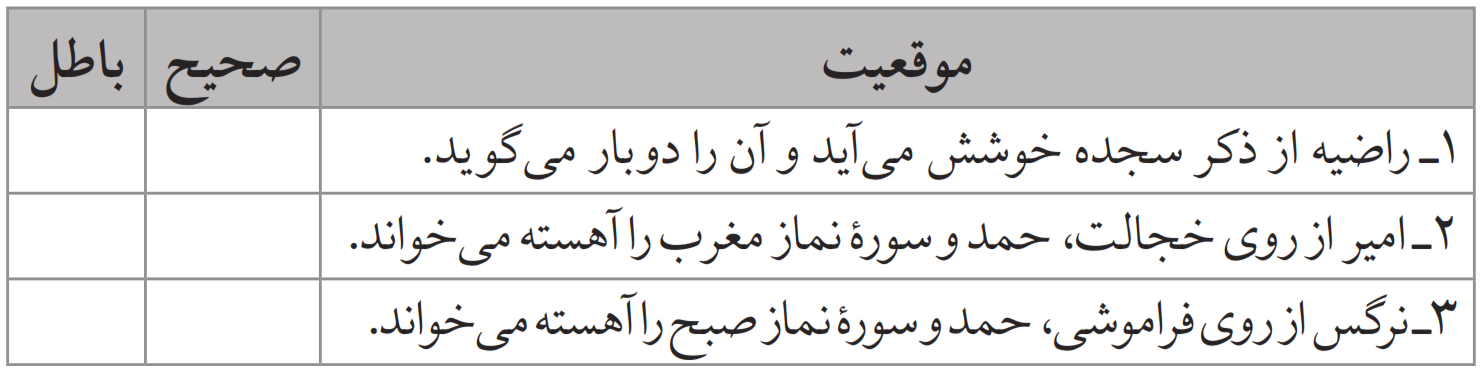 صحیح یا باطل بودن نماز را در موقعیت های زیر مشخص کنید.