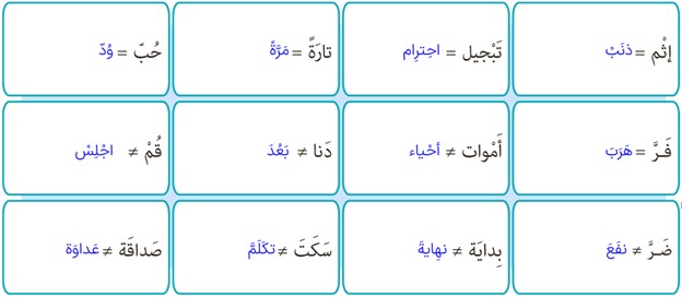 وُدّ / بَعُدَ / تکَلَمَّ / اجْلِسْ / نهِايةَ / عَداوَة / احِترِام / أحْياء / مَرَّةً / نفَعَ / ذنَبْ / هَرَبَ