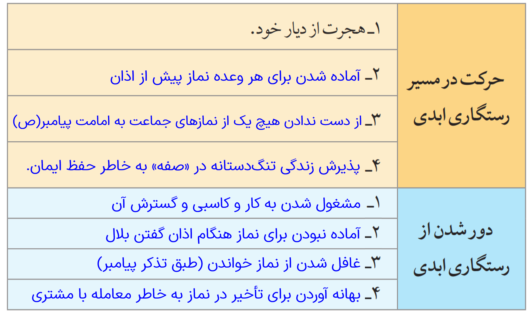 همانطور که در درس نهم آمده، دین به ما اجازه نمیدهد آخرتمان را فدای دنیا کنیم. بنابراین، هنگامی که بلال اذان میگفت، من کار و معامله را رها میکردم و مانند گذشته (قبل از ثروتمند شدن)، برای نماز جماعت در اول وقت حاضر میشدم.