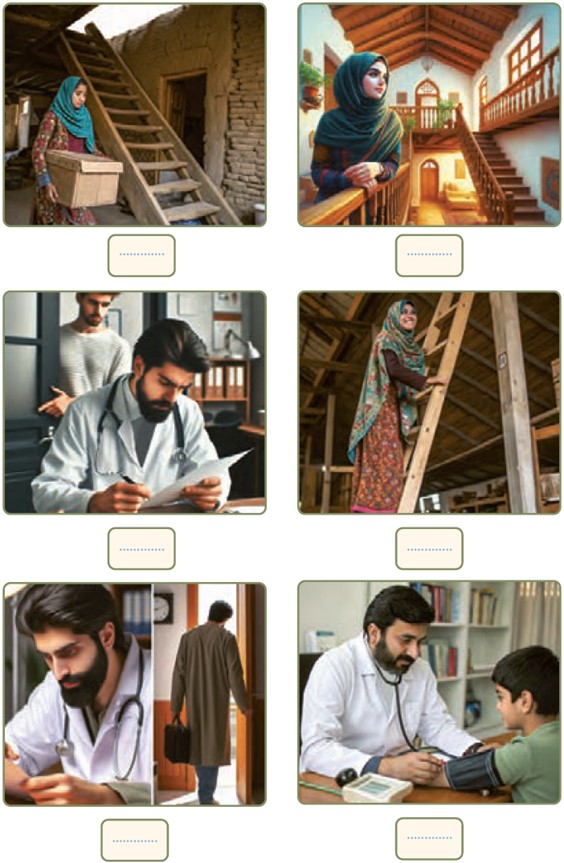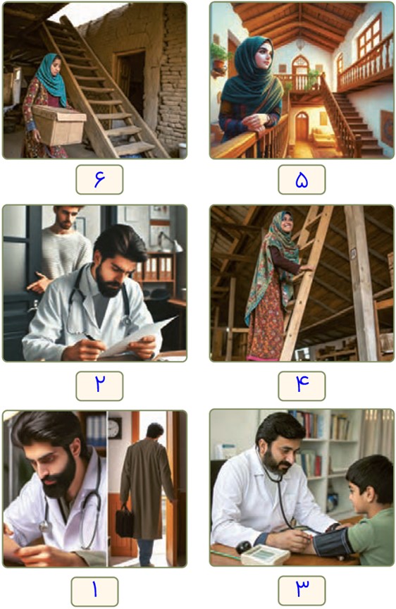 شمارۀ هر جمله را زیر تصویرِ خودش بنویسید.