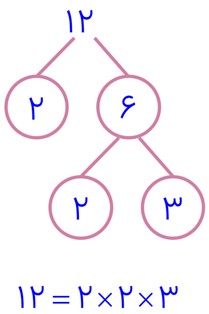 برای تجزیهٔ عدد ۱۲، آن را به دو شاخهٔ ۲ و ۶ تقسیم میکنیم. چون ۲ اول است، شاخهاش تمام میشود. سپس ۶ را به دو شاخهٔ ۲ و ۳ تقسیم میکنیم. چون این دو عدد هم اول هستند، کار تمام میشود. در نهایت، شمارندههای اول ۱۲ عبارتند از: ۲، ۲ و ۳