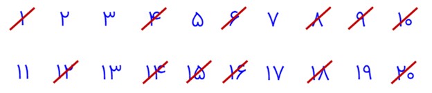 مثال: برای پیدا کردن اعداد اول تا ۲۰ با روش غربال: