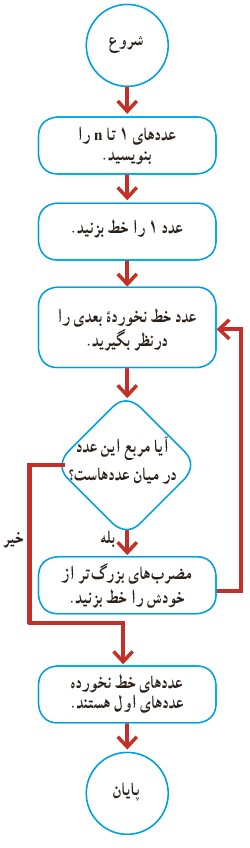 این یک مهارت کلیدی در ریاضیات است که یعنی بتوانی یک فرآیند الگوریتمی را مرحله به مرحله اجرا کنی. کتاب برای نمایش الگوریتم غربال از یک نمودار (فلوچارت) استفاده کرده است.