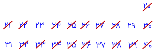 2 با روش غربال، عددهای اول بین 20 و 40 را پیدا کنید. در این روش، کار را از خط زدن مضرب های کدام عدد شروع می کنید و با مضرب های کدام عدد پایان می دهید؟