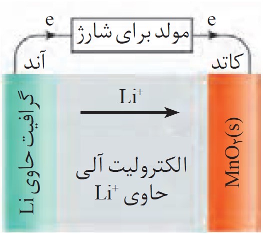 پ هنگامی که تلفن یا رایانه همراه در حال شارژ شدن است و باتری نقش سلول الکترولیتی را دارد، چگونگی جابه جایی الکترون ها و یون های لیتیم را توصیف کنید.