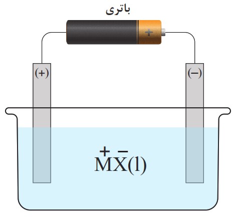 الکترون از یونها در سطح الکترود مثبت (+) آزاد میشود؛ آزاد شدن الکترون همان فرایند اکسایش است. همانطور که در قسمت (ب) توضیح داده شد، یونهای منفی \({X^ - }\) در الکترود مثبت الکترونهای خود را از دست میدهند (آزاد میکنند).