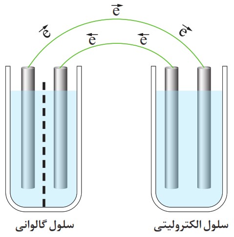 ت انجام واکنش غیر خودبهخودی: این جریان اجباری الکترون که توسط باتری ایجاد شده، باعث میشود در سلول الکترولیتی یک واکنش شیمیایی غیر خودبهخودی انجام شود: