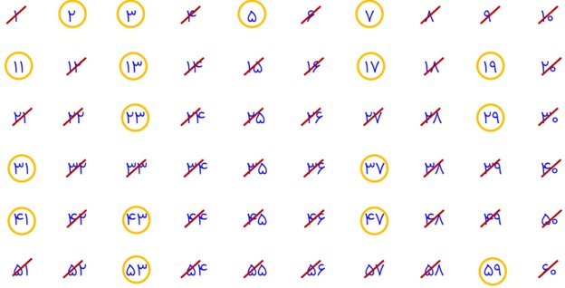 1 از روش غربال برای عددهای 1 تا 60 استفاده و عددهای اول کمتر از 60 را پیدا کنید.