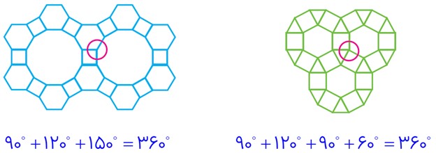2 هر یک از طرح های زیر با استفاده از سه نوع کاشی منتظم طراحی شده است. با محاسبهٔ زاویه های داخلی هر کاشی منتظم، نشان دهید زاویهٔ مشخص شده در هر شکل 360 درجه است.