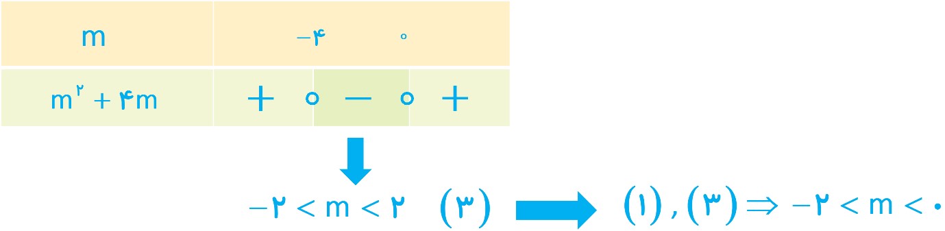 3 به ازای چه مقادیری از m، سهمی \(y = m{x^2} - mx - 1\) همواره پایین محور xهاست؟