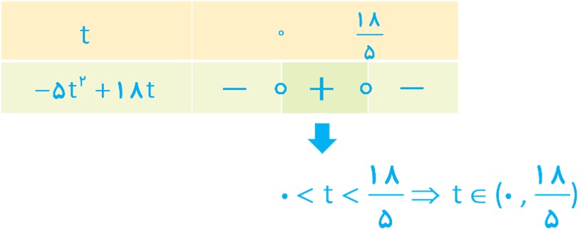 4 یک جسم از بالای یک ساختمان که ١٣ متر ارتفاع دارد، به هوا پرتاب می شود. اگر ارتفاع این جسم از سطح زمین در ثانیهٔ t از رابطۀ \(h = - 5{t^2} + 18t + 13\) محاسبه شود، در چه فاصلهٔ زمانی، ارتفاع توپ از سطح زمین بیشتر از ١٣ متر خواهد بود؟