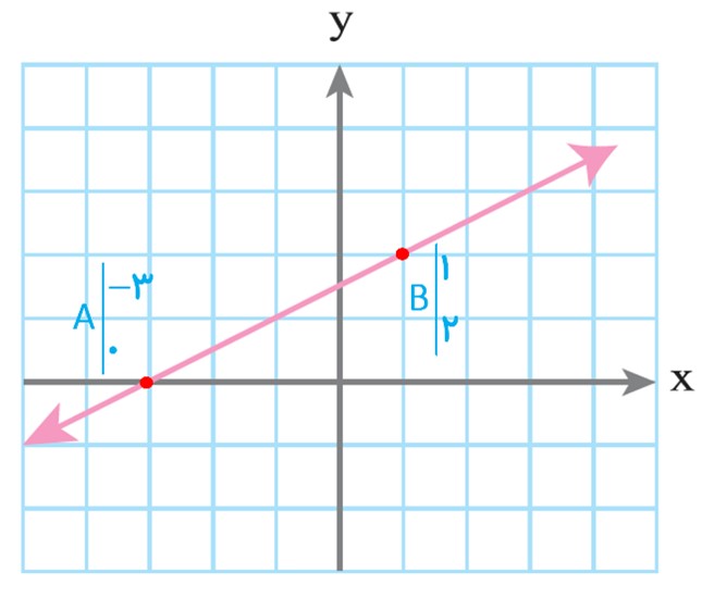 \(\begin{array}{*{20}{l}}{m = \frac{{2 - 0}}{{1 - \left( { - 3} \right)}} = \frac{1}{2}}\\{y - {y_0} = m\left( {x - {x_0}} \right) \Rightarrow y - 2 = \frac{1}{2}\left( {x - 1} \right)}\\{ \Rightarrow y = \frac{1}{2}x + \frac{3}{2}}\end{array}\)