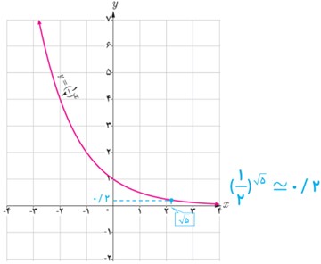 ب نمودار تابع با ضابطهٔ \(y = {(\frac{1}{2})^x}\) را رسم کنید و مقدار تقریبی \({(\frac{1}{2})^{\sqrt 5 }}\) را با توجه به نمودار به دست آورید.