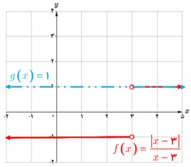 \(\begin{array}{l}f\left( x \right) = \frac{{\left| {x - 3} \right|}}{{x - 3}} = \left\{ {\begin{array}{*{20}{l}}\begin{array}{l}1\;\;\:\:\:{\mkern 1mu} ,\;\;\:x > 3\\\end{array}\\{ - 1\;\;\:,\;\;\:x < 3}\end{array}} \right.\\\\g\left( x \right) = 1\\\\\left\{ {\begin{array}{*{20}{l}}\begin{array}{l}\mathop {\lim }\limits_{x \to {3^ + }} f\left( x \right) = 1\\\end{array}\\{\mathop {\lim }\limits_{x \to {3^ - }} f\left( x \right) = - 1}\end{array}} \right.\\\\ \Rightarrow \mathop {\lim }\limits_{x \to {3^ + }} f\left( x \right) \ne \mathop {\lim }\limits_{x \to {3^ - }} f\left( x \right)\end{array}\)