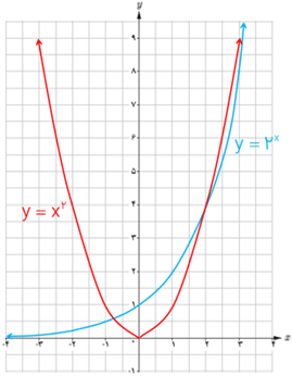 تابع \(y = {2^x}\) همواره افزایشی و یک به یک است در حالی که تابع \(y = {x^2}\) یک به یک نیست. این دو نمودار یکدیگر را در سه نقطه قطع می کنند. دو نقطه آن به طول های 4=x و 2=x و طول نقطه سوم بین دو طول 0 و 1- قرار دارد.
