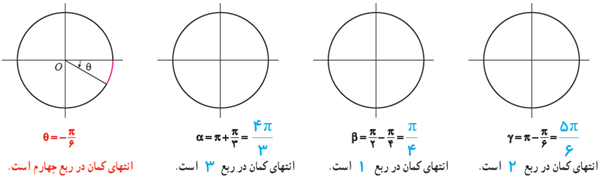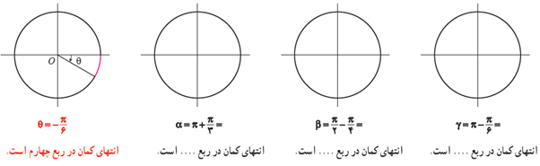 1 برای هر یک از زاویه های زیر مشخص کنید که انتهای کمان در کدام ربع دایره مثلثاتی قرار می گیرد و سپس شکل تقریبی زاویه را همانند نمونه رسم کنید.