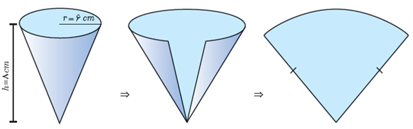 \(\begin{array}{l}d = \sqrt {{r^2} + {h^2}} = \sqrt {{6^2} + {8^2}} = \sqrt {100} = 10\;cm\\L = 2\pi r = 12\pi \;cm\\\theta = \frac{L}{d} = \frac{{12\pi }}{{10}} = \frac{{6\pi }}{5}\;rad\end{array}\)