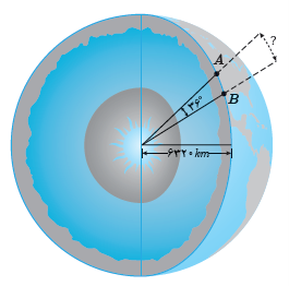 4 فاصلهٔ دو نقطهٔ A و B از کرهٔ زمین، که بر روی یک نصف النهار قرار دارند، مطابق شکل روبه رو، برابر طول کمانی از دایره گذرنده از آن دو نقطه است. با داشتن اندازهٔ شعاع کره زمین فاصله بین دو نقطهٔ داده شده را بیابید.