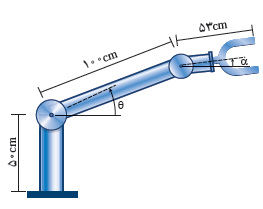 ب فرض کنید این روبات برای گرفتن یک شیء در ارتفاع \(23/5 cm\) مفصل دوم خود را در حالت \(a = - 30^\circ \) قرار داده است. تعیین کنید زاویه \(\theta \) در این وضعیت چند درجه است؟