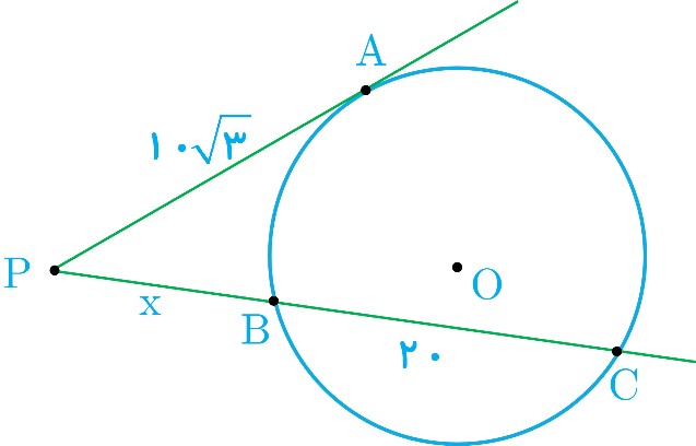 2 از نقطهٔ P در خارج دایره ای، مماس PA به طول \(10\sqrt 3 \) را بر آن رسم کرده ایم (A روی دایره است). همچنین خطی از P گذرانده ایم که دایره را در دو نقطهٔ B و C قطع کرده است و BC=20. طول های PB و PC را به دست آورید.