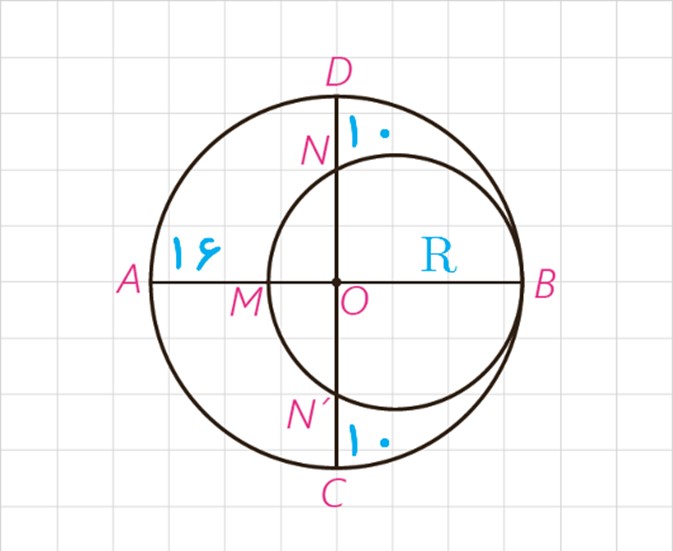 3 در شکل مقابل، دو دایره برهم مماس و دو قطر AB و CD از دایره بزر گتر برهم عمودند. اگر AM=16 و ND=10، شعاع های دو دایره را پیدا کنید.