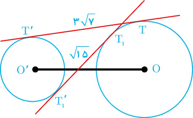 5 طول شعاع های دو دایرهٔ متخارج را به دست آورید که طول مماس مشترک خارجی آنها مساوی \(3\sqrt 7 \) و طول مماس مشترک داخلی آنها \(\sqrt {15} \) و طول خط المرکزین آنها مساوی ٨ واحد است.