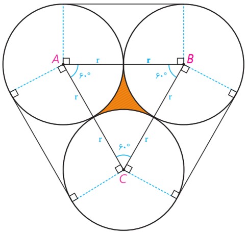 6 سه دایره به شعاع های برابر r دو به دو برهم مماس اند. مطابق شکل مقابل این سه دایره به وسیلهٔ نخی بسته شده اند. نشان دهید طول این نخ برابر \(6r+2πr\). همچنین نشان دهید مساحت ناحیه محدود به سه دایره برابر \({r^2}(\sqrt 3 - \frac{\pi }{2})\) است.
