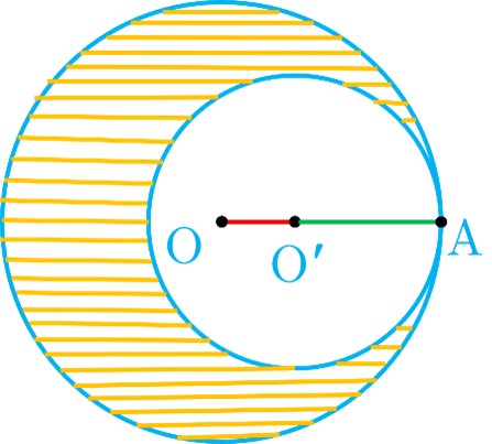 \(\begin{array}{l} = \pi {R^2} - \pi {{R'}^2} = 16\pi \\ \Rightarrow {R^2} - {{R'}^2} = 16\\ \Rightarrow \left( {R - R'} \right)\left( {R + R'} \right) = 16\;\;,\;\;OO' = R - R' = 2\\ \Rightarrow 2\left( {R + R'} \right) = 16 \Rightarrow R + R' = 8\\\left\{ \begin{array}{l}R - R' = 2\\R + R' = 8\end{array} \right. \Rightarrow \left\{ \begin{array}{l}R = 5\\R' = 3\end{array} \right.\end{array}\)