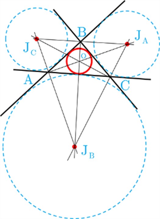\(\begin{array}{l}AT + AT' = c + BT + b + CT'\;\;,\\AT = AT'\;\;,\;\;BT = BO\;\;\;,\;\;\;CT' = CO\\ \Rightarrow 2AT = c + b + BO + CO = c + b + a = 2P\\ \Rightarrow 2AT = 2P \Rightarrow AT = AT' = P\end{array}\)