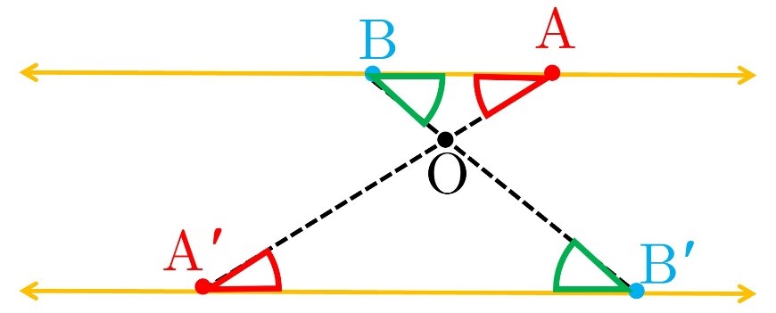\( \Rightarrow A\mathop O\limits^\Delta B \sim A'\mathop O\limits^\Delta B' \Rightarrow \left\{ \begin{array}{l}\widehat {OAB} = \widehat {OA'B'}\\\widehat {OBA} = \widehat {OB'A'}\end{array} \right.\) ق 2 تشابه مثلث