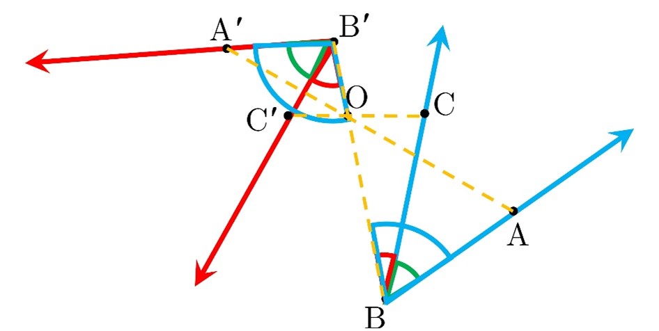 1) اگر نقطه O روی رأس زاویه یعنی نقطه B باشد آنگاه مجانس زاویه یعنی زاویه A’B’C’ روی خود زاویه ABC منطبق می شود، پس اندازه آن حفظ می شود.