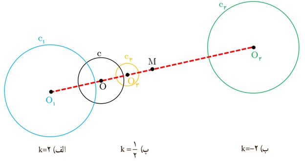 2 دایره C(O,R) نقطه M خارج این دایره مفروض است. مجانس این دایره را نسبت به نقطه M در هر حالت رسم کنید.