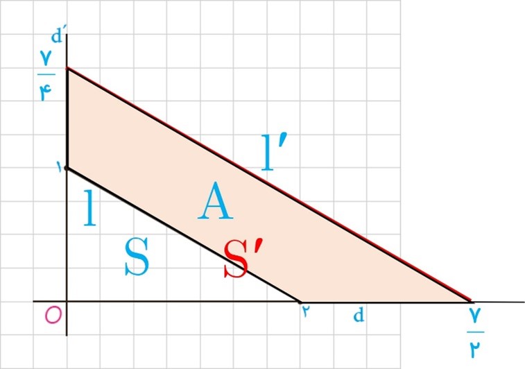 4- در شکل رو به رو اگر خط l را در تجانس به مرکز O و نسبت تجانس کنیم و آن را ʹl بنامیم، مساحت بین خط l و ʹl و خطوط d و ʹd چقدر است؟