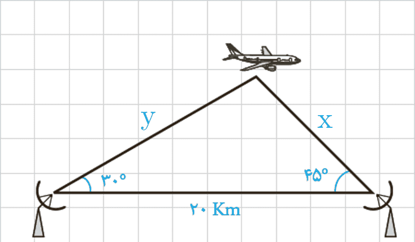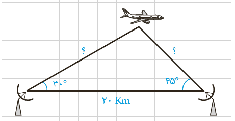 2 دو ایستگاه رادار، که در فاصله ۲۰ کیلومتری از هم واقع اند، هواپیمایی را با زاویه های ۳۰ و ۴۵ درجه رصد کرده اند. فاصله هواپیما را از دو ایستگاه به دست آورید.