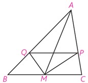 \(\left. \begin{array}{l}\frac{{AM}}{{MB}} = \frac{{AQ}}{{QB}}\;\;\mathop \Rightarrow \limits^{MB = MC} \;\;\frac{{AM}}{{MC}} = \frac{{AQ}}{{QB}}\\\;\;\;\;\;\;\;\;\;\;\;\;\;\;\;\;\;\;\;\;\;\;\;\;\;\;\;\frac{{AM}}{{MC}} = \frac{{AP}}{{PB}}\end{array} \right\} \Rightarrow \frac{{AQ}}{{QB}} = \frac{{AP}}{{PB}}\)