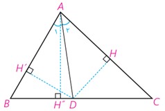 \(\frac{{{S_{ABD}}}}{{{S_{ACD}}}} = \frac{{\frac{1}{2}DH'\; \times AB}}{{\frac{1}{2}DH\; \times AC\;}} = \frac{{AB}}{{AC}}\;\;(1)\)