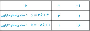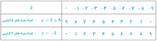 تعداد وزنه های 3 کیلویی را با x و تعداد وزن های 5 کیلویی را با y نمایش می دهیم؛ بنابراین: