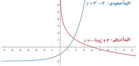 4 تابع نمایی \(y = {2^x} - 2\) و تابع لگاریتمی \(y = - {\log _2}x + 2\) را رسم کنید و در مورد یکنوایی آنها در کلاس بحث کنید.