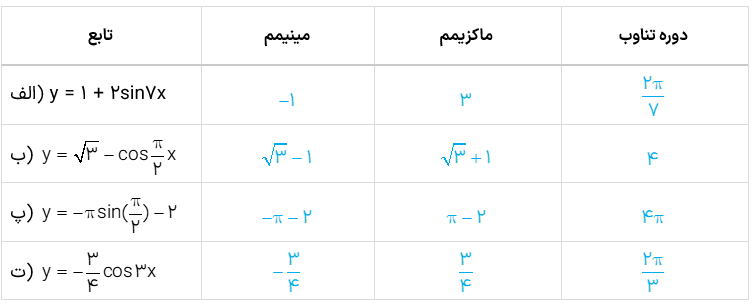 1 دوره تناوب و مقادیر ماکزیمم و مینیمم هر یک از توابع زیر را به دست آورید.