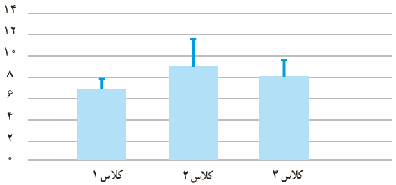6 با توجه به تأثیر کمیت و کیفیت خواب بر یادگیری، ندا و آوا در مطالعه ای با بررسی تمامی دانش آموزان سه کلاس پایهٔ دهم، میانگین میزان خواب این دانش آموزان را در هفتهٔ گذشته برحسب ساعت پرسیدند و ثبت کردند. آنها پس از گردآوری داده ها و بررسی درستی آن را به صورت نمودارهای زیر نمایش دادند. (در این نمودارها بلندی مستطیل، نشان دهندهٔ میانگین و میلهٔ خطا نشان دهندهٔ انحراف معیار است.)