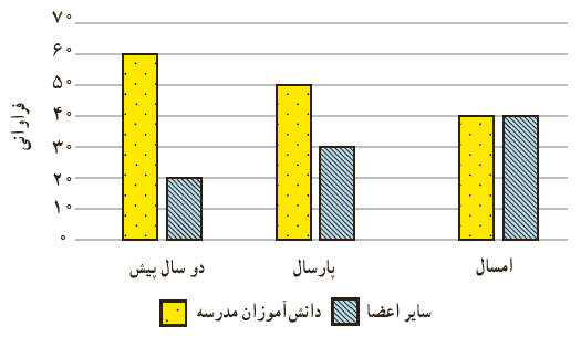 7 مدرسه ای برای ترویج فرهنگ کتاب خوانی، از دو سال پیش به غیر از دانش آموزان مدرسه، از خارج از مدرسه نیز عضو می پذیرد. نمودار میله ای زیر نشان دهندهٔ روند تغییرات فراوانی اعضای جدید کتابخانه در دو گروه مذکور است.