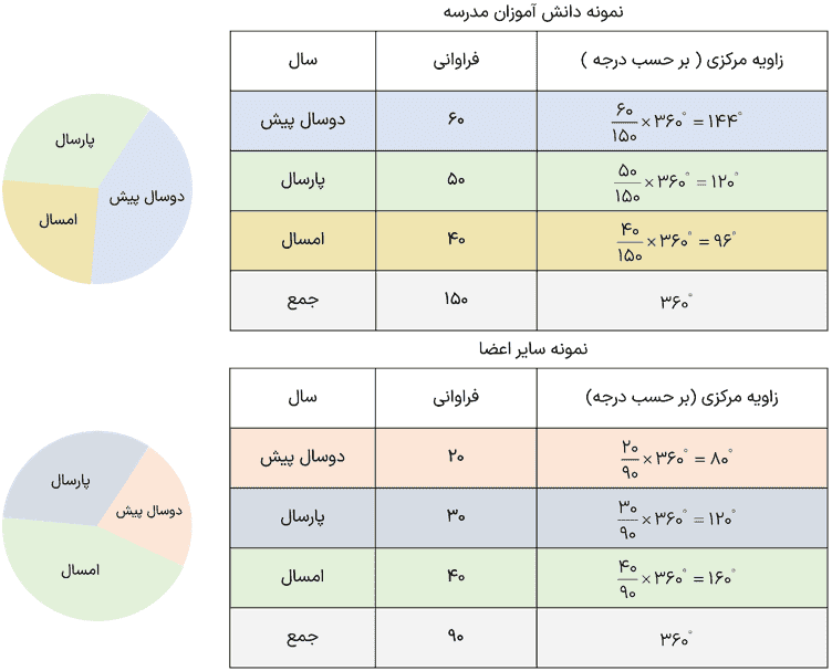 پ با استفاده از نمودارهای میله ایِ داده شده، برای هریک از این سه سال یک نمودار دایره ای جداگانه رسم کنید.