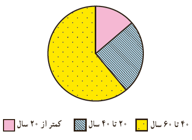 8 فراوانی بازدیدکنندگان از یک سالن نمایش در گروه های سنی مختلف در نمودار دایره ای روبه رو نمایش داده شده است. (در این نمودار، ٥٤ درجه مربوط به گروه سنی کمتر از ٢٠ سال، ٩٠ درجه مربوط به گروه سنی ٢٠ تا ٤٠ سال و بقیه مربوط به گروه سنی ٤٠ تا ٦٠ سال است.)
