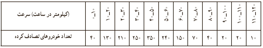 9 جدول زیر نشان دهندهٔ تعداد تصادف خودروها و سرعت حرکت آنها در زمان تصادف است.