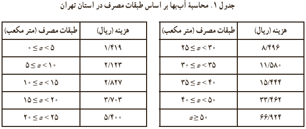 1 برای محاسبهٔ قبض آب 1 (آب بها) هر واحد مسکونی در شهر تهران ابتدا میانگین مصرف هر واحد مسکونی محاسبه می شود و بر اساس آن «طبقۀ مصرفی» واحد مسکونی با توجه به «جدول 1» تعیین می گردد. آنگاه به کمک رابطهٔ زیر، آب بها محاسبه می شود:
