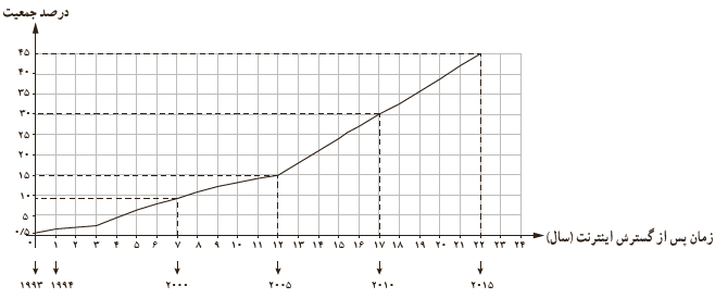 ب با توجه به مدل خطی استفاده کنندگان از اینترنت از سال 2005 تا 2015 ، با به دست آوردن ضابطهٔ تابع خطی، در سال 2020 درصد استفاده کنندگان از اینترنت در جهان چقدر خواهد بود؟
