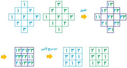 اگر آن دو مربع را A و B بنامیم، اعداد درون مربع های A شماره ماشین و اعداد درون مربع های B شماره مسیر را مشخص می کنند. لذا مربع حاصل از کنار هم قرر دادن درایه های آن ها، جواب مسئله است.