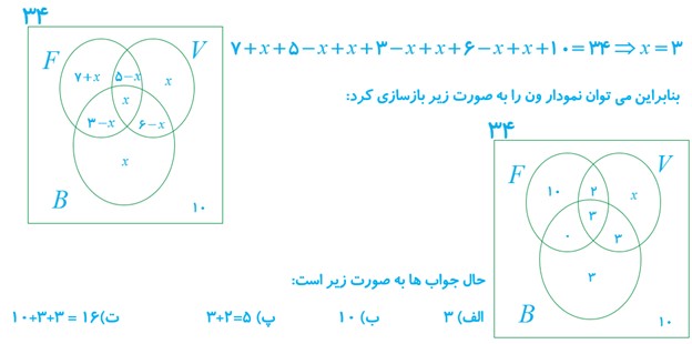 ٣ در یک کلاس 34 نفری، 15 نفر فوتبال بازی می کنند، 11 نفر والیبال و 9 نفر بسکتبال بازی می کنند. اگر بدانیم 10 نفر عضو هیچ یک از این سه تیم نبوده و 5 نفر فوتبال و والیبال، 6 نفر والیبال و بسکتبال و 3 نفر فوتبال و بسکتبال بازی می کنند مشخص کنید: