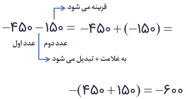 زیر دریایی دوم 150 متر پایین تر از زیر دریایی اول می باشد؛ بنابراین 450- با عدد 150 متر آن هم با علامت منفی جمع می شود. داریم: